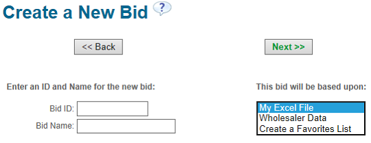 The Bid Wizard currently supports three types of bids; My Excel File, Wholesaler Data and Favorites Lists.